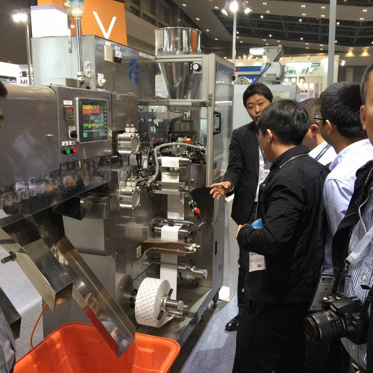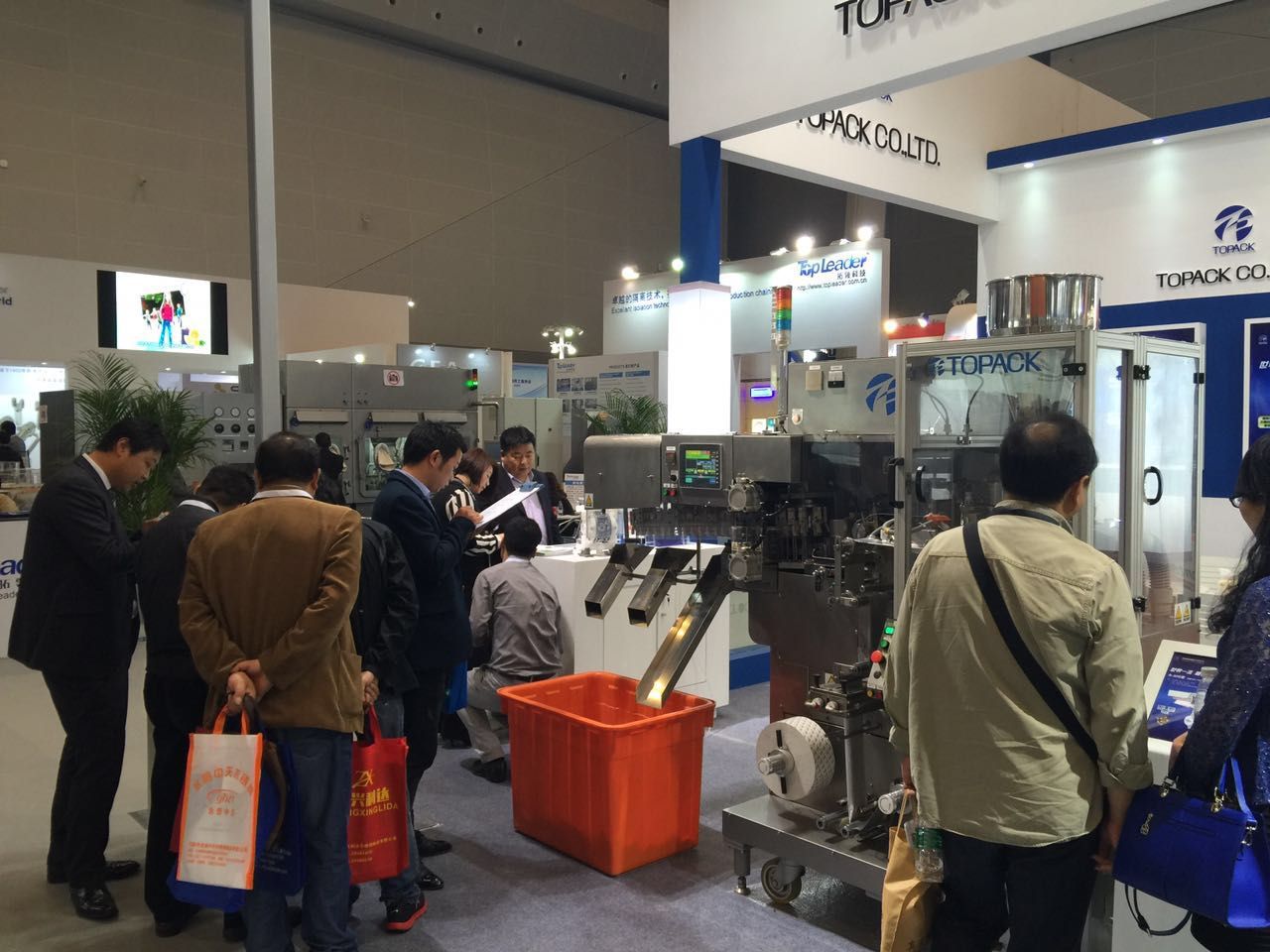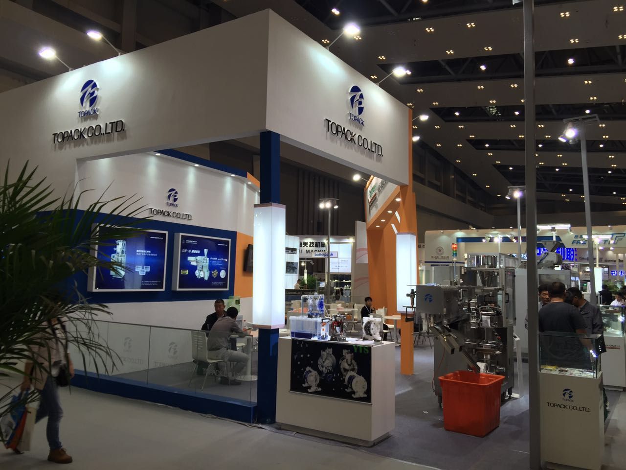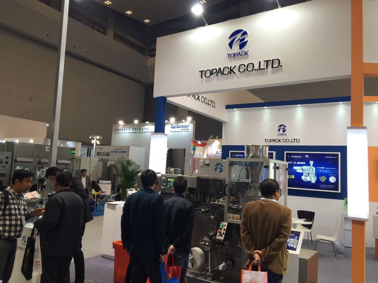 這是我們公司的展臺,展品是日本TOPACK三邊封充填包裝機,整體展臺的搭建是干凈、利落透著舒適,顏色也搭配簡潔明亮,吸引了不少人的眼光,來咨詢的客戶也是蠻多的。