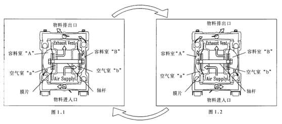 軸桿上固定有兩個膜片,每端一個。當壓縮空氣供至空氣室b(右側(cè),見圖1.1)時,軸桿向右移動,容料室B中的物料被擠出,同時被吸進容料室A中。